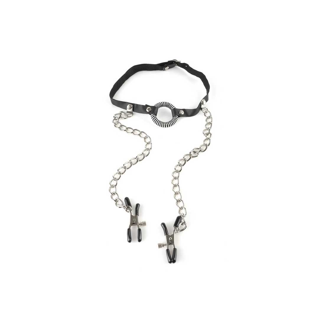 Fabricat din metal rezistent si curele din piele ecologica, calusul in forma de inel mentine gura deschisa pentru un control total asupra partenerului. Clemele pentru sfarcuri sunt prevazute cu un strat protector si lanturi metalice, oferind un plus de stimulare vizuala si tactila.